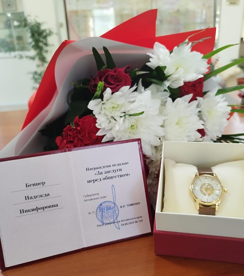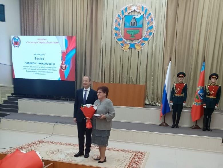 Указом губернатора Алтайского края Виктора Томенко №139 от 4 августа 2025 года, за активную общественную деятельность МЕДАЛЬЮ «ЗА ЗАСЛУГИ ПЕРЕД ОБЩЕСТВОМ» награждена Надежда Никифоровна Беннер, председатель Алтайской районной организации АКО ВОИ.